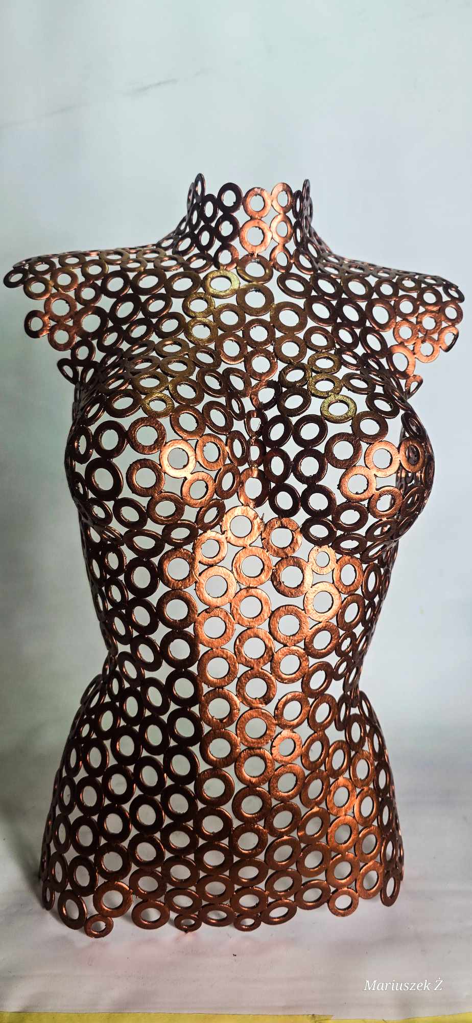 Przedstawiamy Ci niezwykły produkt, którym jest metalowy tors kobiety wykonany z pospawanych ze sobą podkładek. Każdy detal tego unikalnego dzieła został stworzony z niezwykłą starannością i dokładnością, co sprawia, że odwzorowuje idealnie kształt kobiecego ciała.