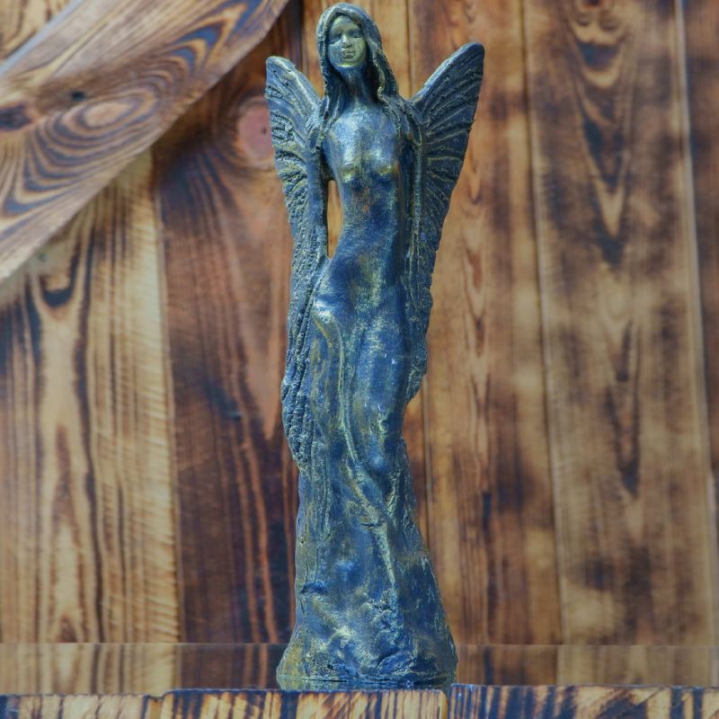 Anioł gipsowy przedstawiający postać nagiej kobiety w kolorze przetartego złota jest wykonany z wysokiej jakości materiałów, co gwarantuje trwałość i estetyczny wygląd. Jego delikatne rzeźby i wykończenie dodają mu uroku i elegancji.