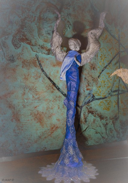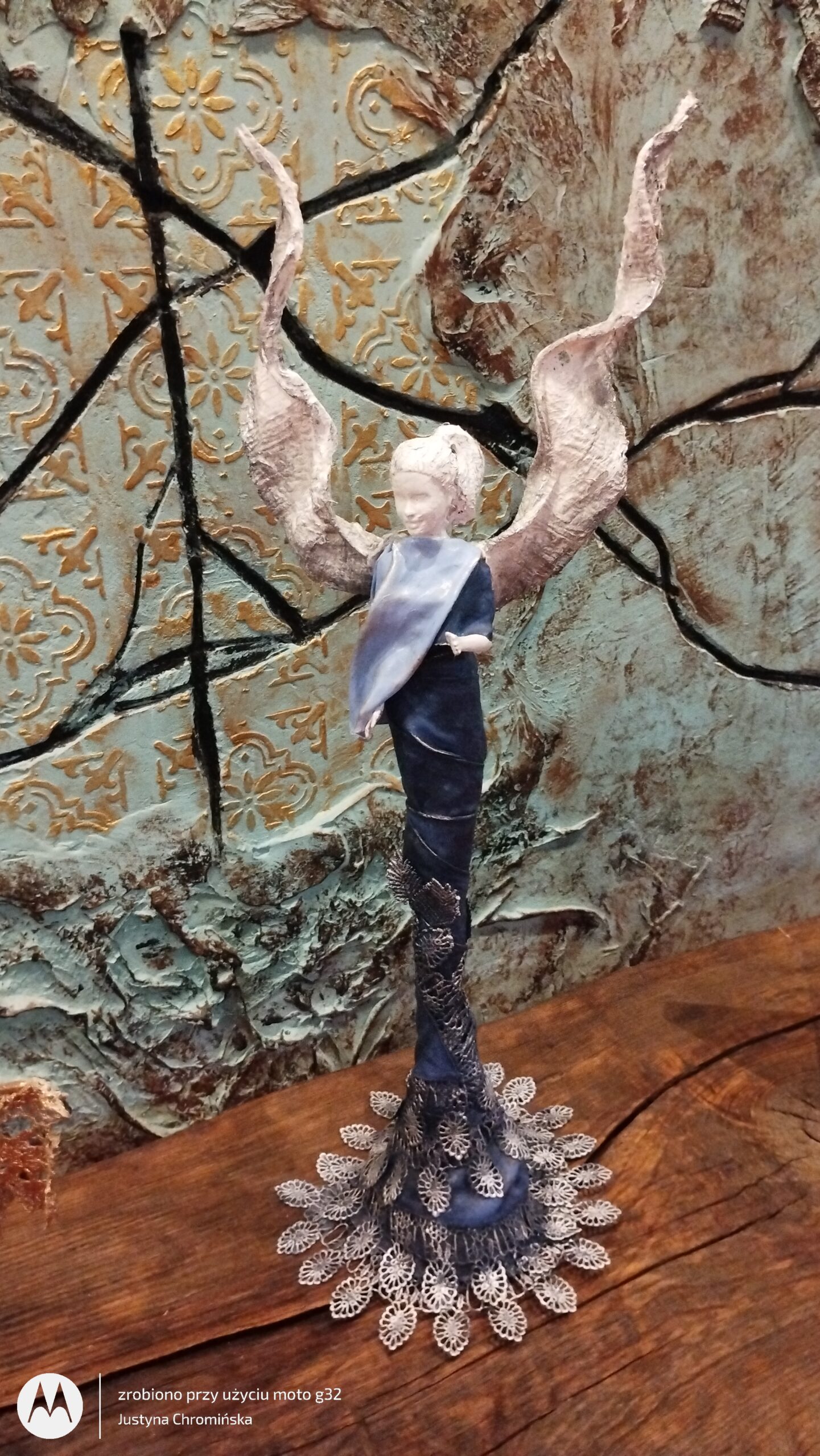 Anioł wykonany z tkaniny utwardzonej metodą powertexu, pomalowany ręcznie w bardzo gustownym i eleganckim stylu, w odcieniach granatu i srebra. Ma on drobną główkę z zamkniętymi oczami i delikatne rysy twarzy. Jego skrzydła są długie i wąskie, przypominające wstążki, a spódnica rozkloszowana u dołu, tworząc kształt przypominający kielich kwiatu.