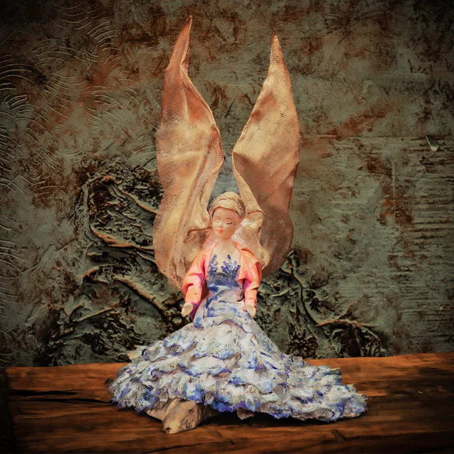 Prezentujemy tu niezwykłego Anioła wykonanego metodą powertexu z tkanin odzyskanych i starych zalęgających firan. Nasz Anioł jest przedstawiony w pozycji siedzącej, emanujący delikatnością i spokojem. Jego różnorodne pastelowe barwy nadają mu subtelności i harmonii.