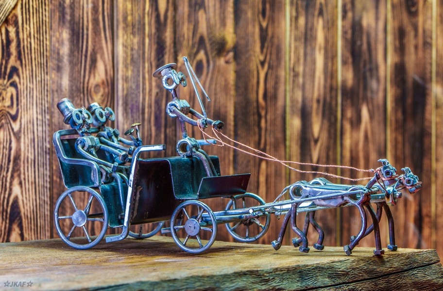 Przedstawiamy Państwu unikalną dorożkę z końmi i woźnicą, wykonaną z odpadów z metalu. To prawdziwe dzieło sztuki, stworzone przez podopiecznych fundacji Na Pomoc. Każdy detal tego niesamowitego odwzorowania został wykonany z niezwykłą precyzją i dbałością o detale.