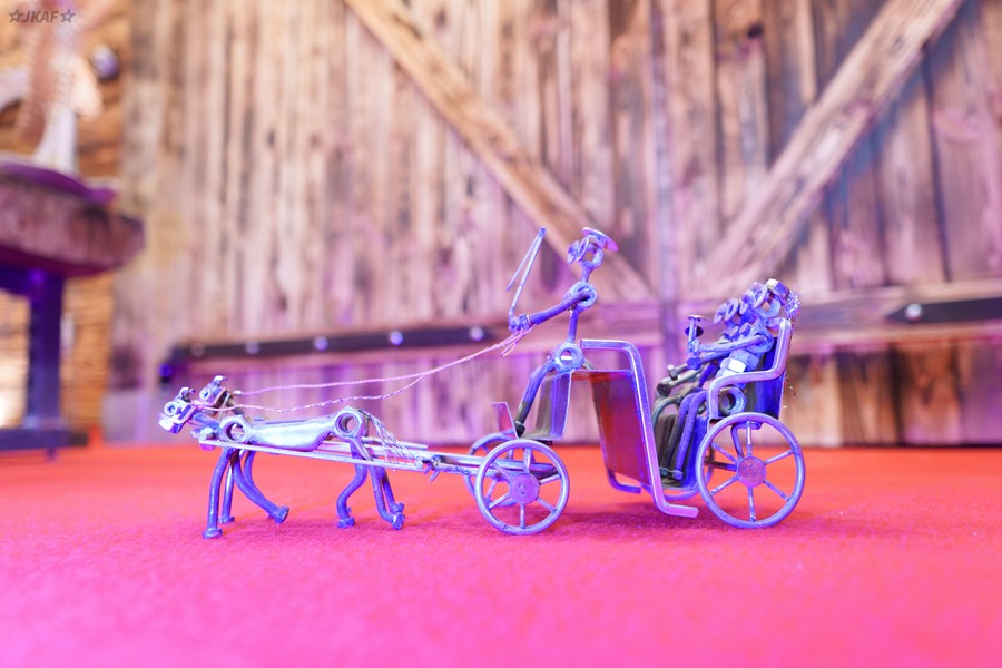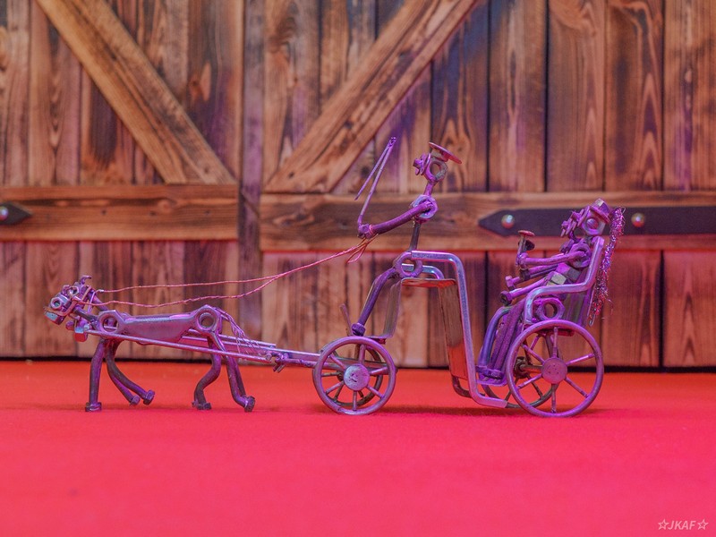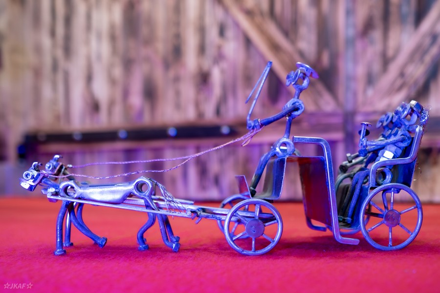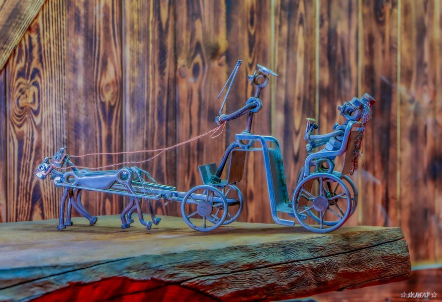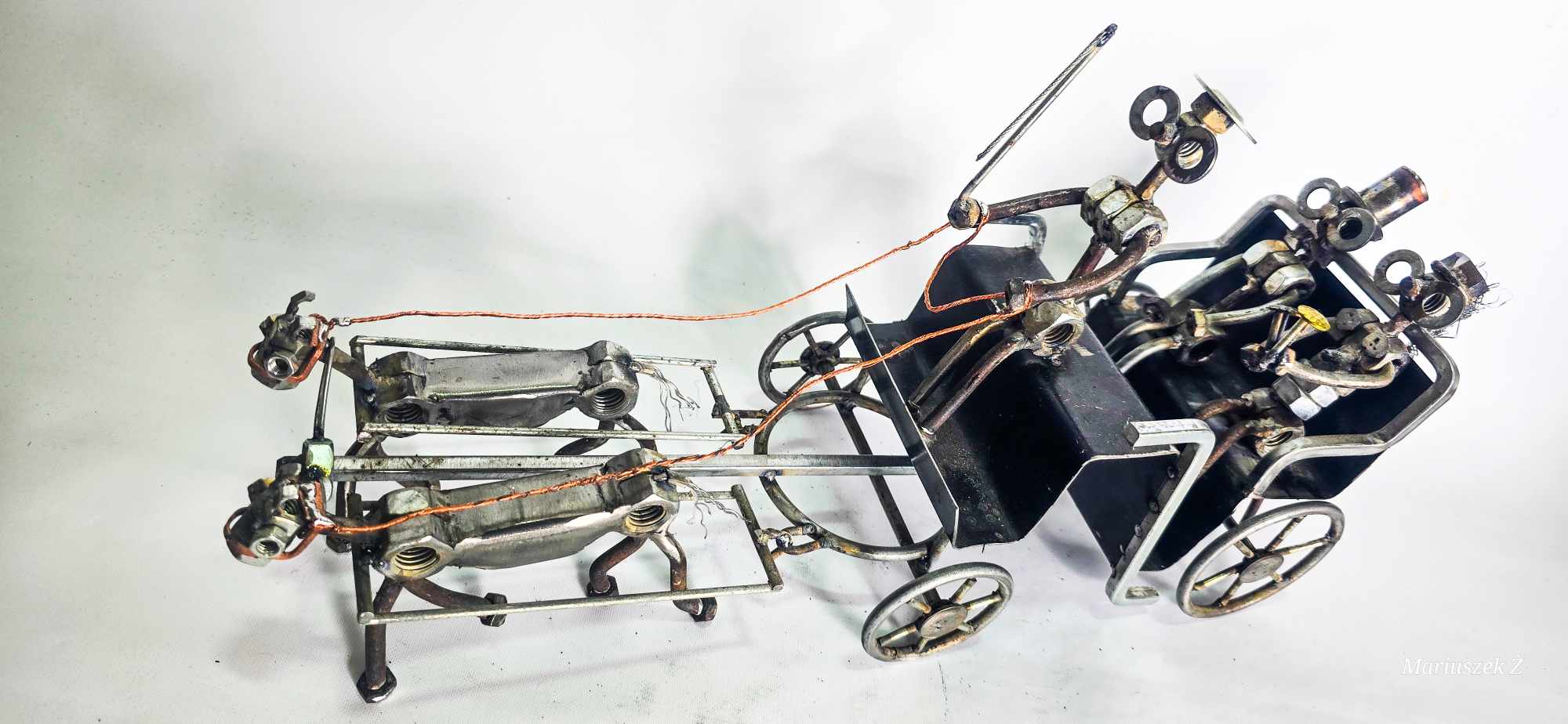 Przedstawiamy Państwu unikalną dorożkę z końmi i woźnicą, wykonaną z odpadów z metalu. To prawdziwe dzieło sztuki, stworzone przez podopiecznych fundacji Na Pomoc. Każdy detal tego niesamowitego odwzorowania został wykonany z niezwykłą precyzją i dbałością o detale.