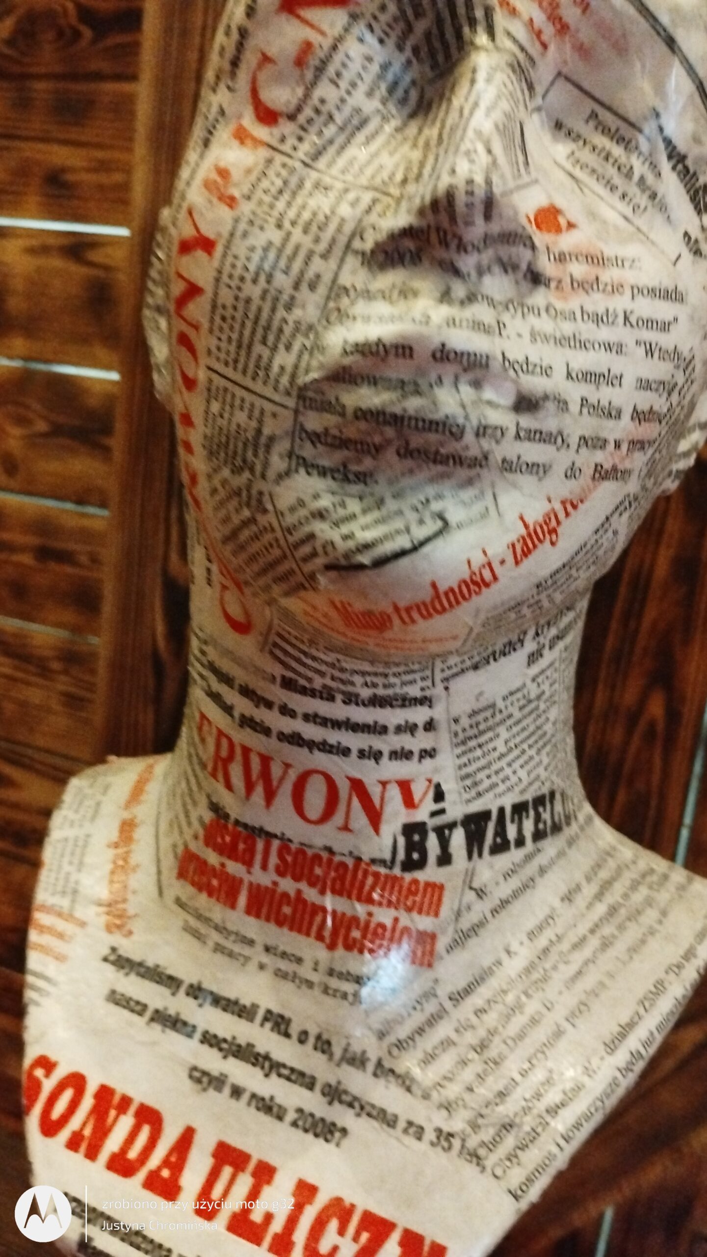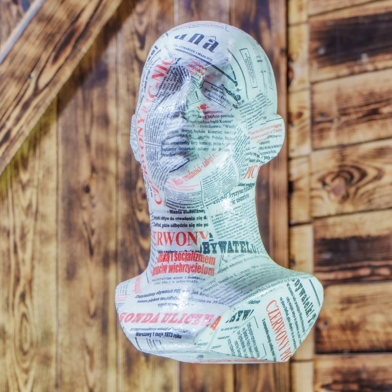 - Materiał: gazeta, drewniany postument, lakier
