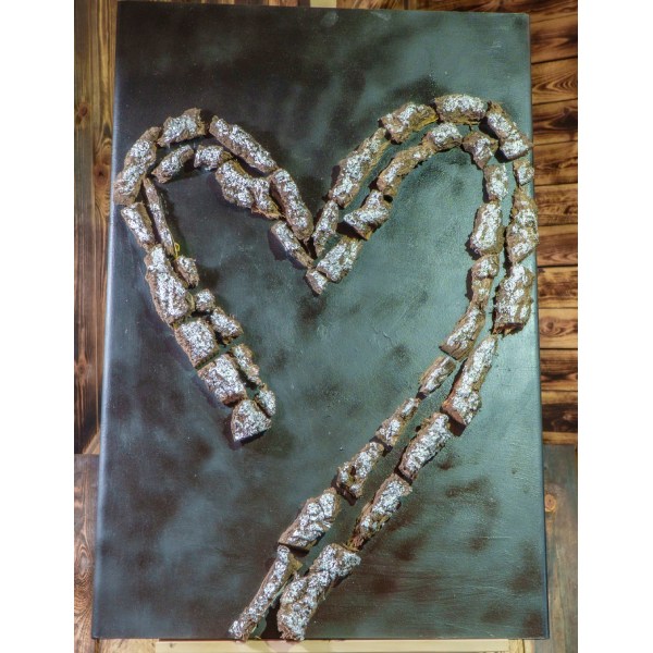 Oto obraz, który przedstawia serce ułożone z kory drewna dębowego. Serce ma kolor czarny, a jego wnętrze jest srebrne. Ten obraz strukturalny jest nie tylko piękny, ale także unikalny.