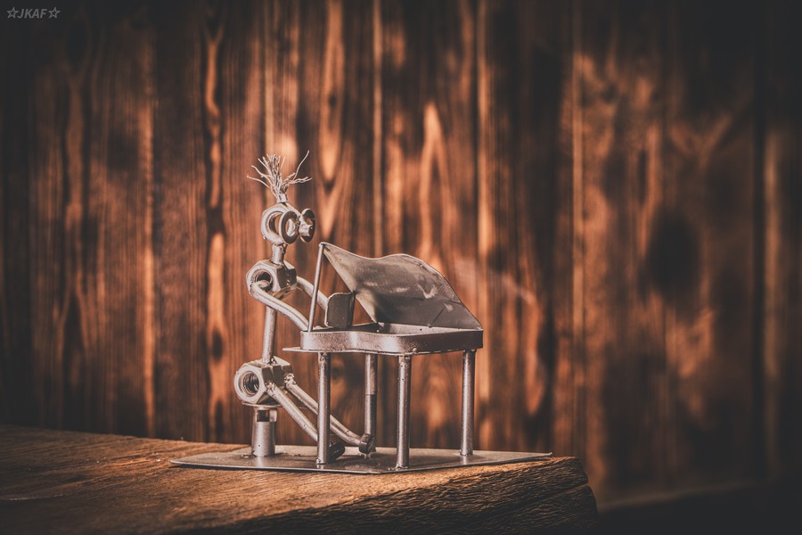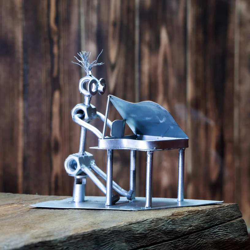Przedstawiamy Państwu unikalną figurkę „Stalowy Wirtuoz”, wykonaną z wysokiej jakości metalu odzyskanego przez utalentowanego artystę Roberta. Ta urocza i wyjątkowa rzeźba przedstawia mężczyznę siedzącego przy fortepianie. Jego dłonie delikatnie dotykają klawiszy, a całość wyraża głęboką koncentrację i pasję do muzyki.