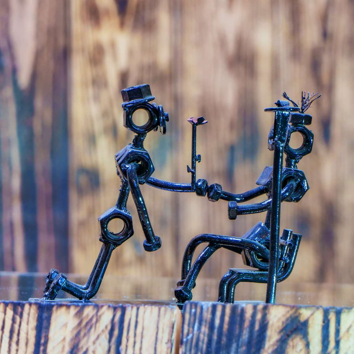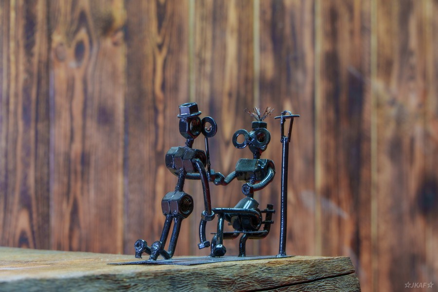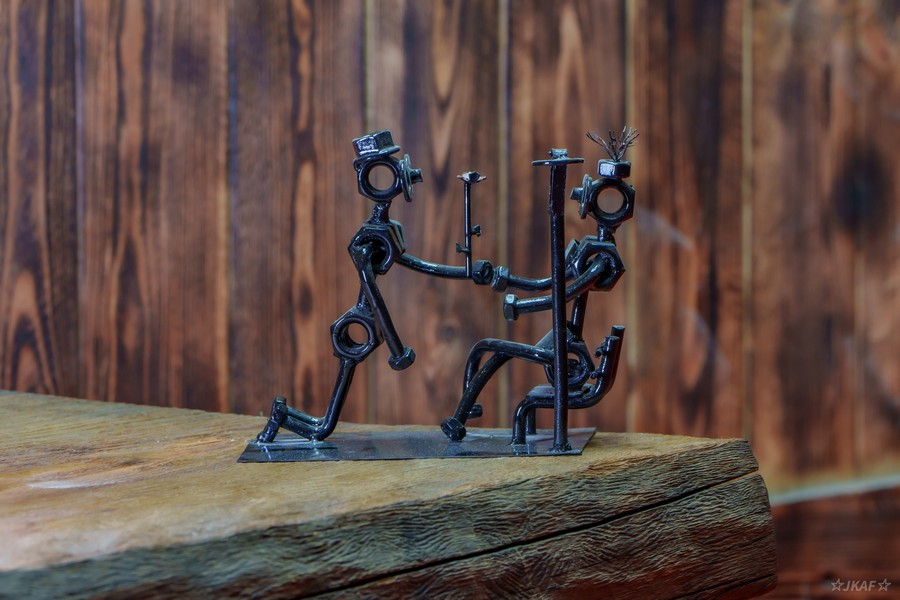 Przepiękna rzeźba wykonana z metalu pochodzącego z odzysku, przedstawiająca romantyczny moment, w którym mężczyzna wręcza kobiecie kwiatka. Każdy element tego dzieła został starannie pospawany, tworząc wyjątkową kompozycję na kształt człowieka.