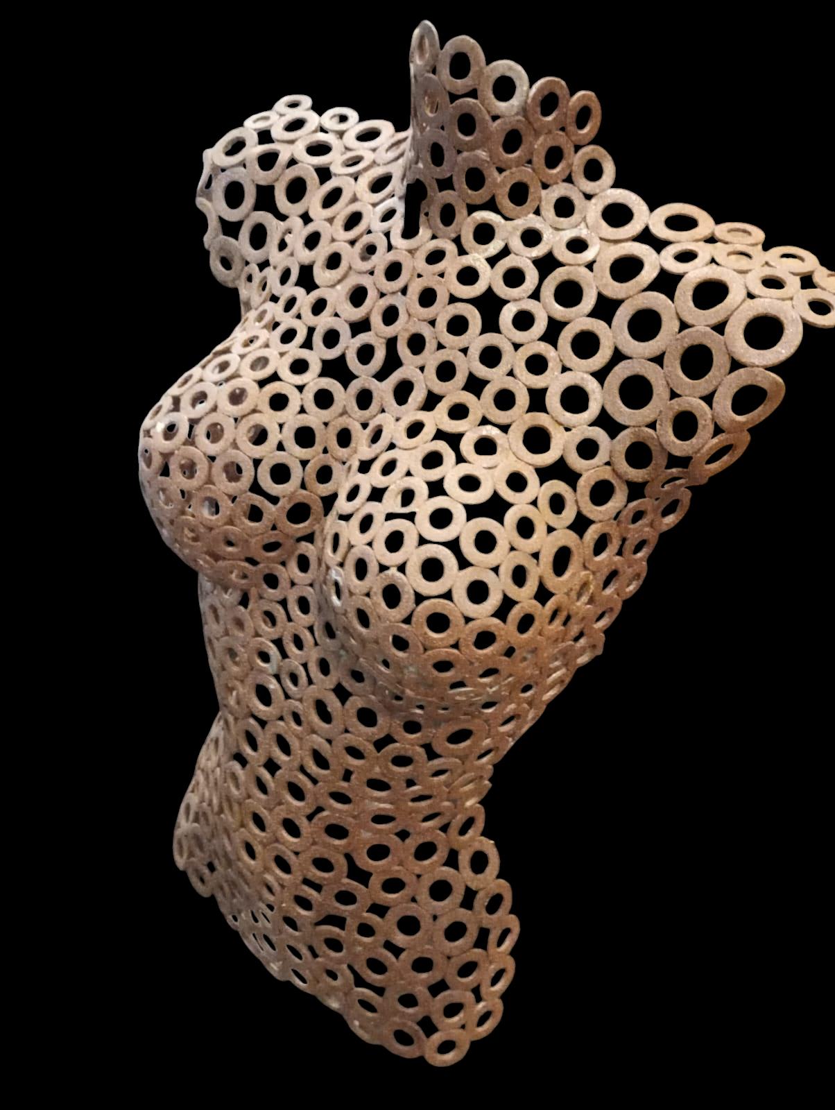 Przedstawiamy Ci niezwykły produkt, którym jest metalowy tors kobiety wykonany z pospawanych ze sobą podkładek. Każdy detal tego unikalnego dzieła został stworzony z niezwykłą starannością i dokładnością, co sprawia, że odwzorowuje idealnie kształt kobiecego ciała.