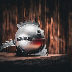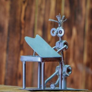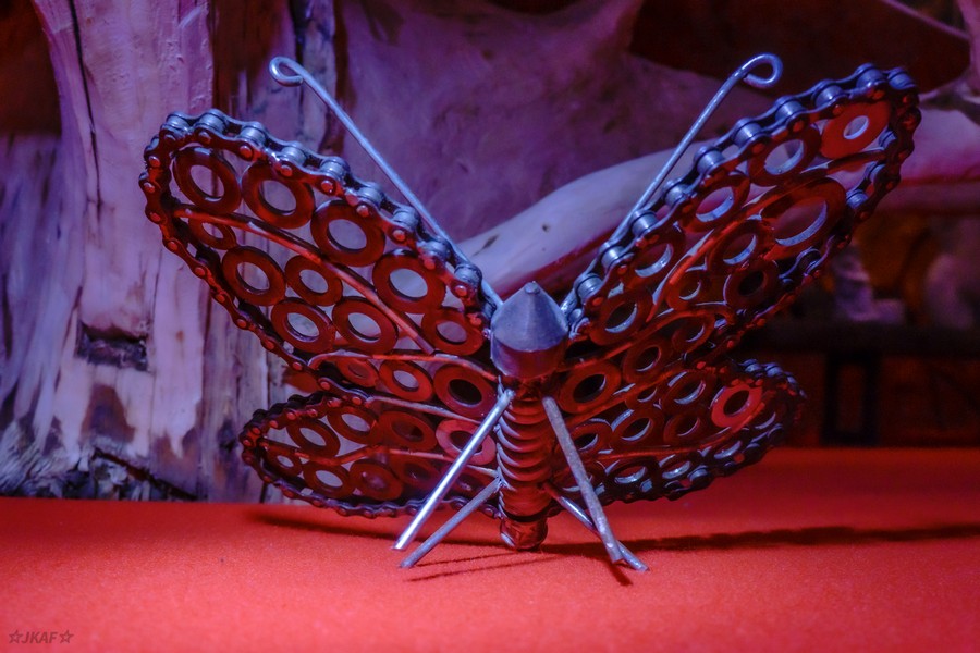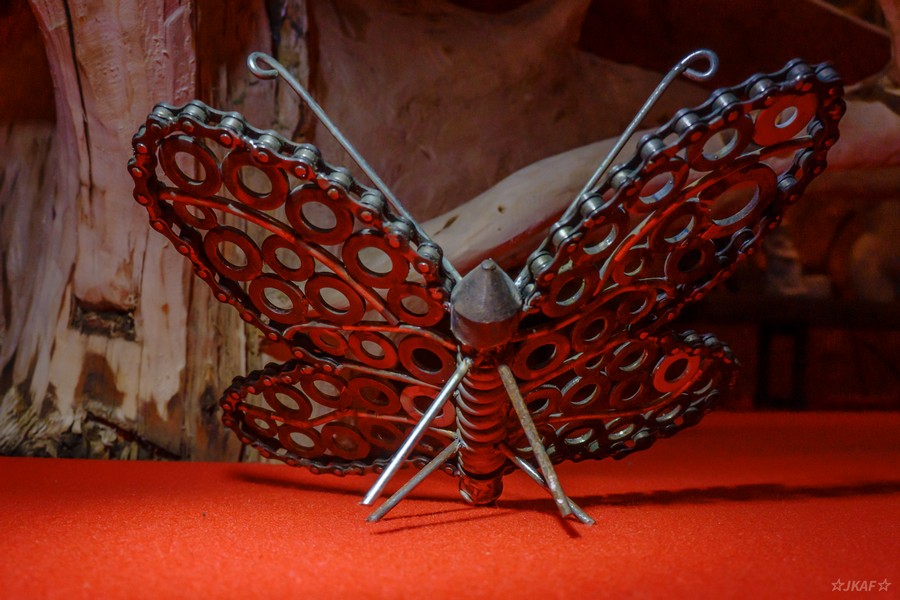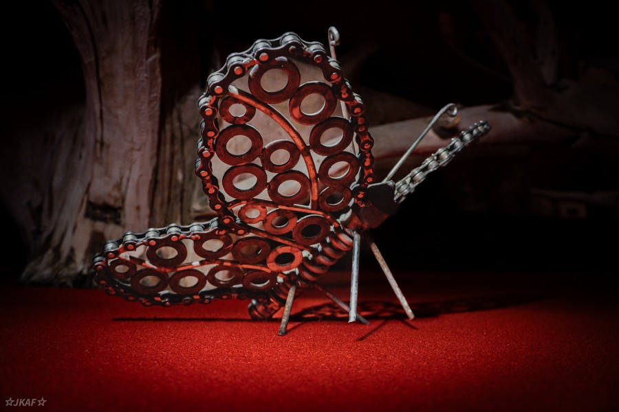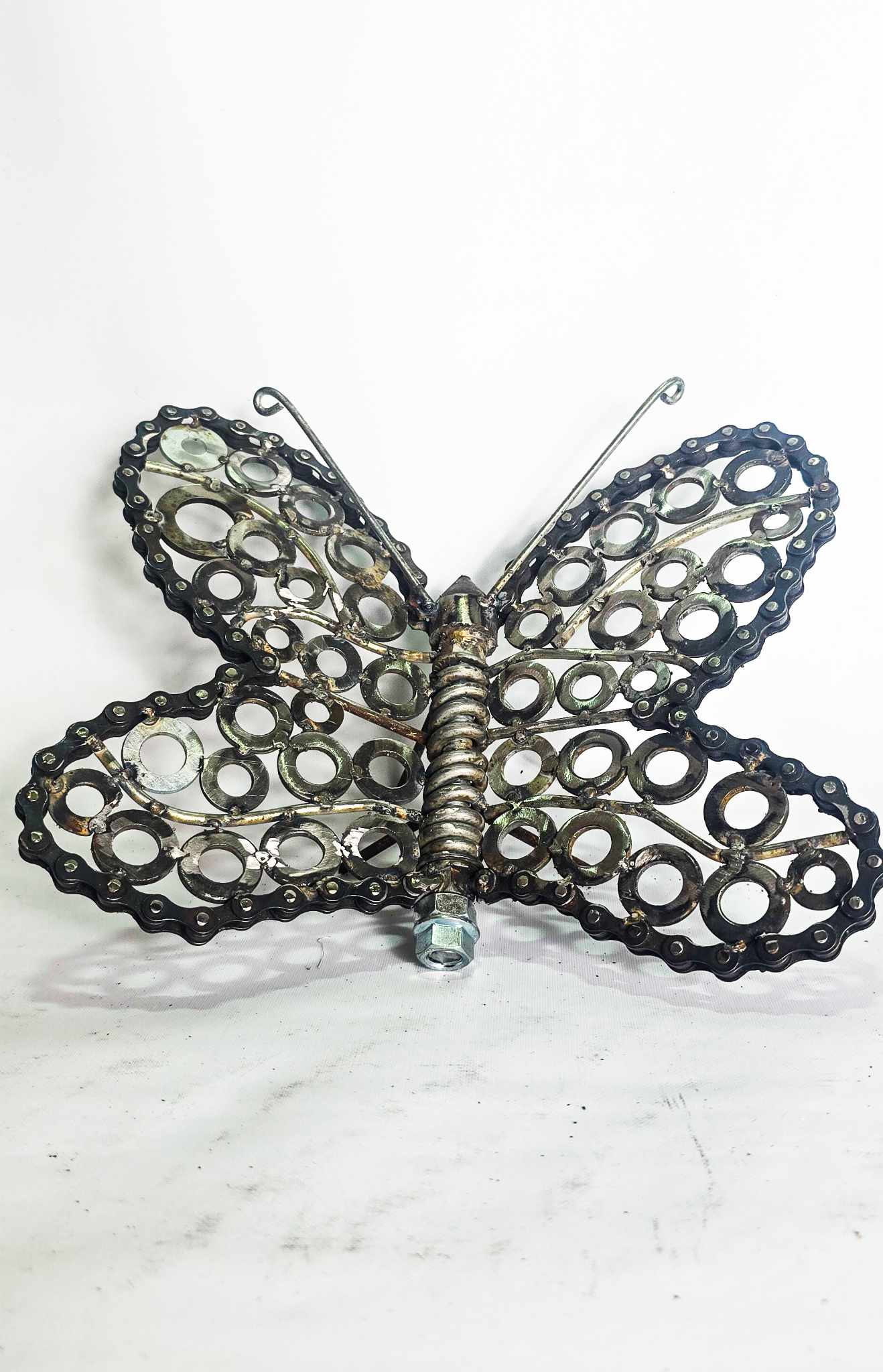 Ten piękny motyl został ręcznie wykonany z części rowerowych, takich jak łańcuchy i koła zębate. Skrzydła motyla są symetryczne i ażurowe, utworzone z połączonych ze sobą ogniw łańcucha i kół zębatych o różnych rozmiarach. Ciało motyla jest smukłe i również wykonane z metalowych elementów. Czułki są długie i cienkie, wygięte ku górze. Motyl stoi na czterech cienkich nóżkach, również wykonanych z metalu.